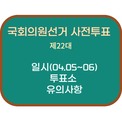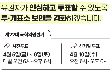 제22대 국회의원선거 사전투표가 전국투표소에서 4월 5일(금)~6일(토), 이틀간 진행되니 신분증을 지참하시고 가까운 투표소를 방문하세요.