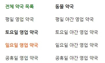 -평일 영업, 공휴일 영업, 토요일 영업, 일요일 영업, 평일 야간 영업, 토요일 야간 영업 , 일요일 야간 영업 , 공휴일 야간 영업, 동물 약국 정보까지 자세하게 분류되어 있는 사이트